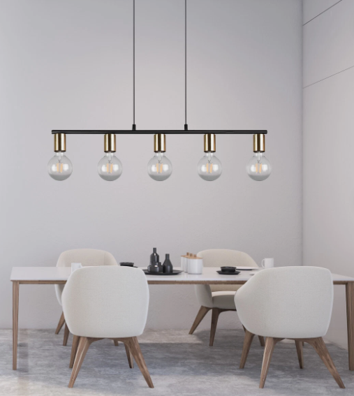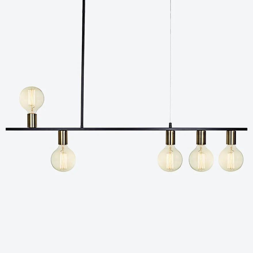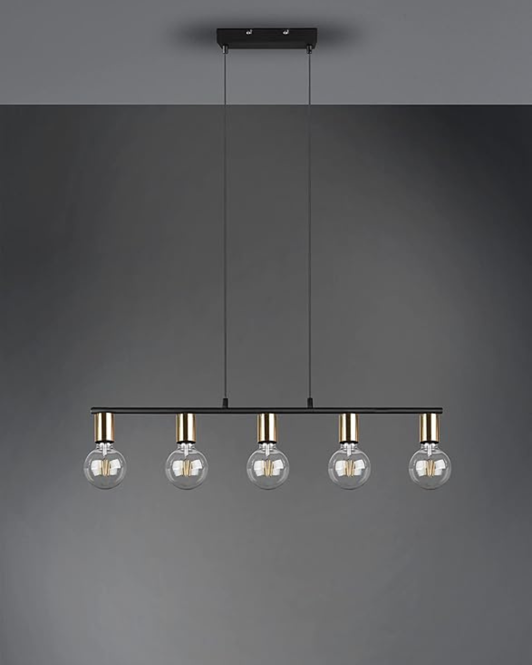 Elegante lámpara de barra negra con cinco globos de cristal ámbar que proyectan una iluminación cálida y acogedora. Ideal para espacios contemporáneos, esta pieza combina funcionalidad y estética sofisticada, creando ambientes con carácter y distinción. Perfecta para comedores, islas de cocina o áreas sociales.