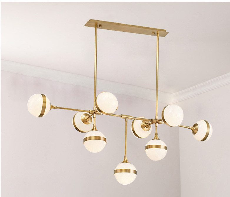 Elegante lámpara decorativa con base dorada que sostiene nueve globos semi-cubiertos, creando un equilibrio perfecto entre funcionalidad e impacto visual. Su diseño sofisticado proporciona una iluminación armoniosa mientras sirve como elemento arquitectónico distintivo en cualquier espacio. Ideal para ambientes que requieren un toque de refinamiento contemporáneo.