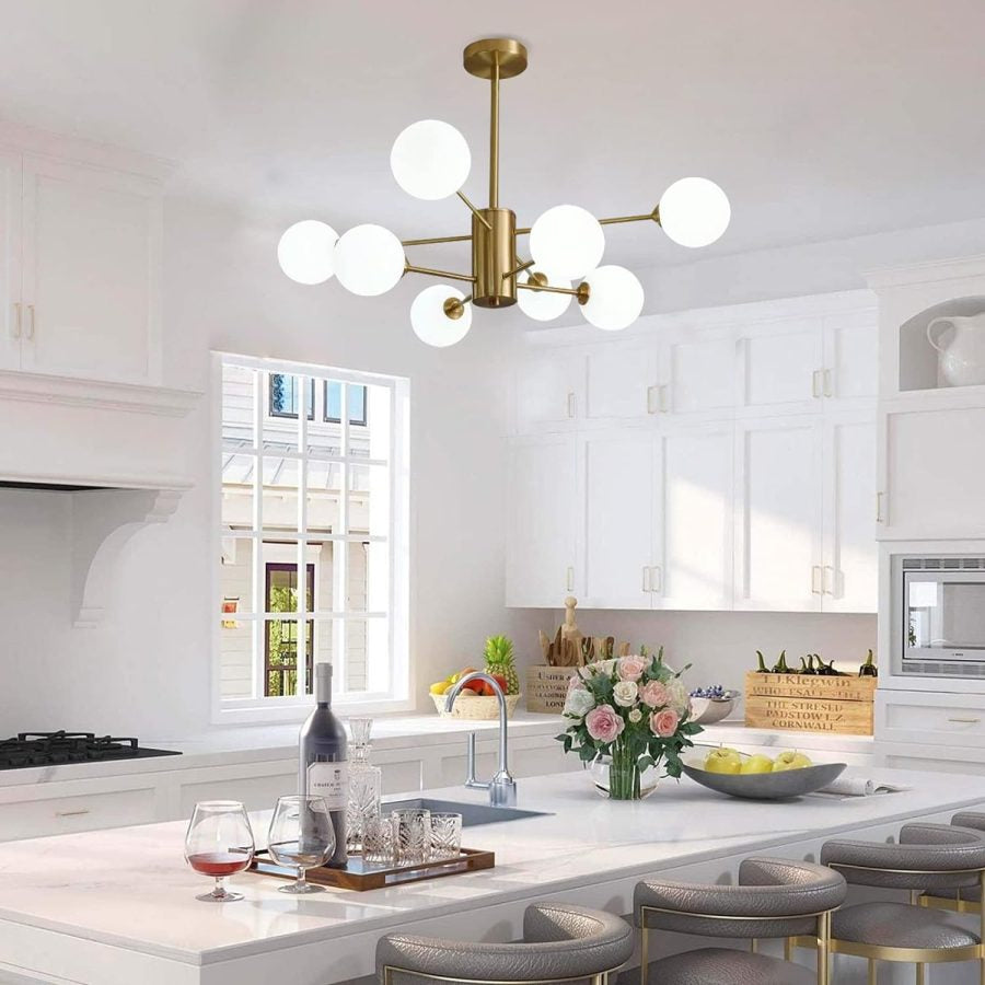 Elegante lámpara decorativa dorada con capacidad para 8 bombillas, diseñada para crear ambientes sofisticados con iluminación equilibrada. Su estructura metálica de acabado dorado aporta un toque de lujo contemporáneo, ideal para espacios que requieren tanto funcionalidad como estética refinada. Perfecta como elemento central en salas, comedores o áreas de recepción.